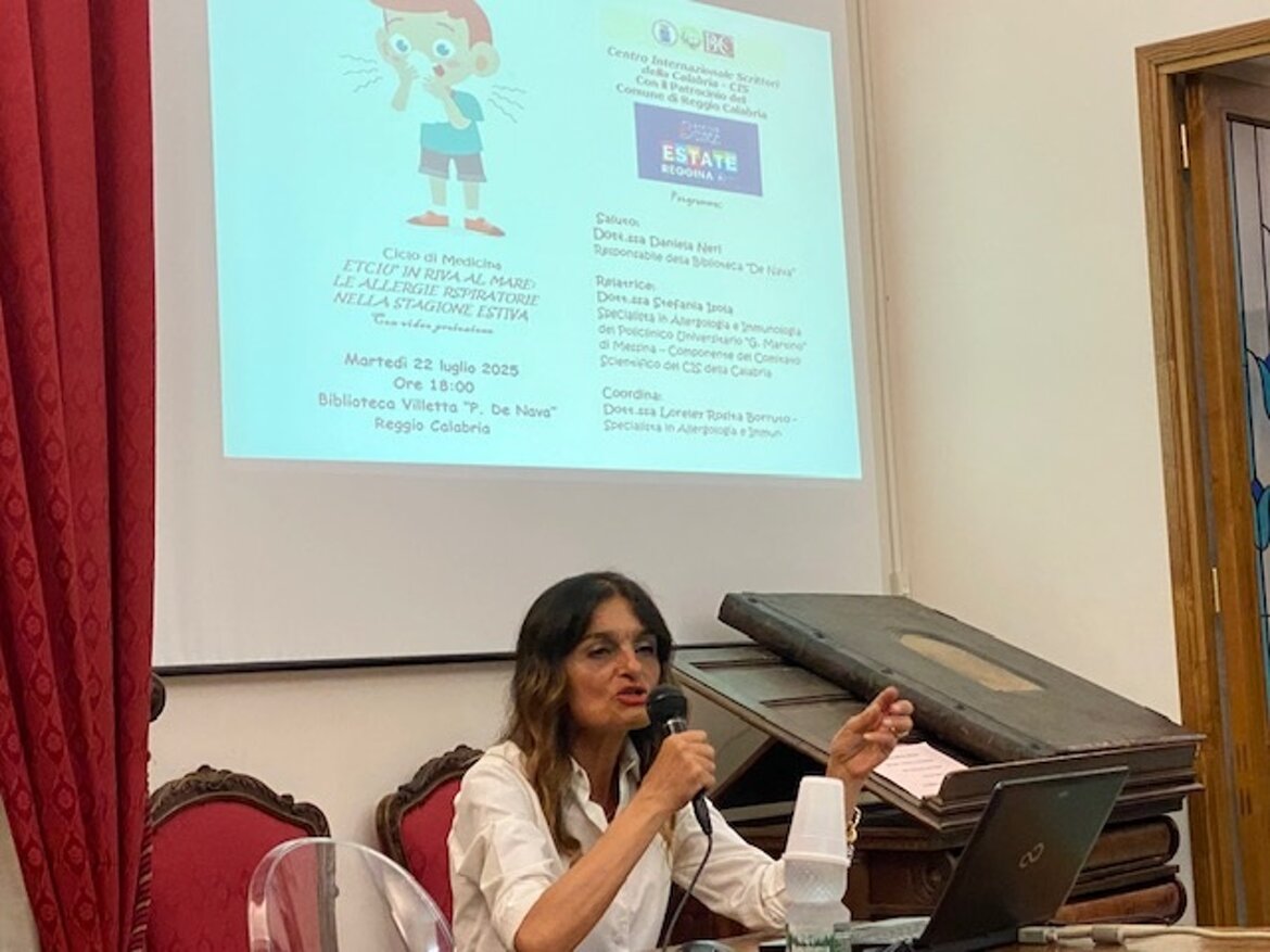 Martedì 22 luglio 2025, presso la Biblioteca Villetta “P. De Nava” di Reggio Calabria, nell’ambito della “Estate Reggina 2025”, il Comune di Reggio Calabria, il Centro Internazionale Scrittori della Calabria (CIS) e la Biblioteca “De Nava” hanno promosso la conferenza “Etciù in riva al mare: le allergie respiratorie nella stagione estiva”. Ha coordinato Loreley Rosita Borruto, presidente del Cis della Calabria, con il contributo di slides ha relazionato Stefania Isola, specialista in Allergologia e Immunologia del Policlinico Universitario “G. Martino” di Messina, componente del Comitato Scientifico del CIS della Calabria. Molte persone soggette ad allergie respiratorie, durante la stagione estiva possono incorrere a crisi respiratorie causate da numerosi allergeni presenti nell’ambiente. Sintomi comuni di queste patologie sono: Starnuti frequenti, Congestione nasale. prurito agli occhi, al naso e alla gola, tosse e raucedine.