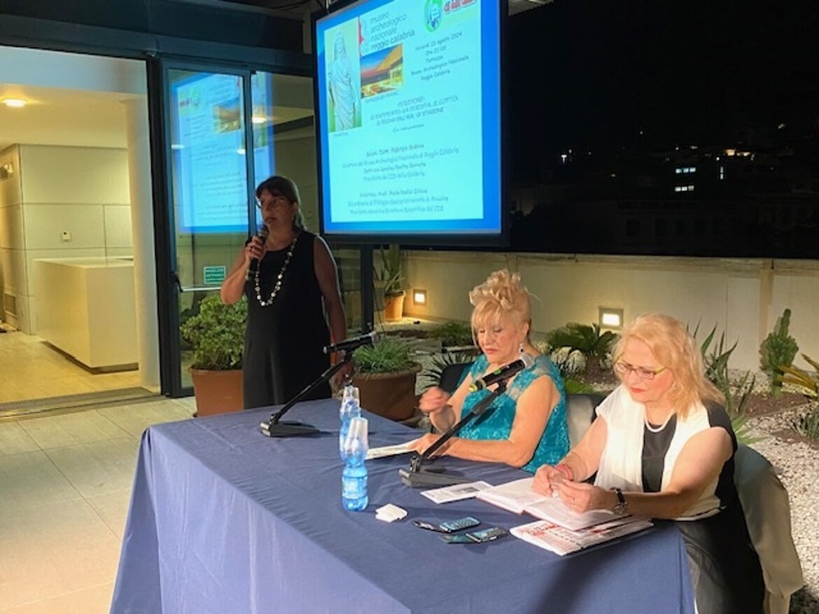 Venerdì 23 agosto 2024, sulla Terrazza del Museo Archeologico Nazionale di Reggio Calabria, lo stesso Museo e il Centro Internazionale Scrittori hanno promosso la conferenza “Persefone: il rapimento, la perdita, il lutto, il regno dell’Ade, le stagioni”. Sono intervenute Assunta Ambrogio, per il Museo Archeologico di Reggio Calabria, e Loreley Rosita Borruto, presidente del CIS della Calabria. Ha relazionato Paola Radici Colace, già ordinario di Filologia Classica, Dipartimento di Civiltà Antiche e Moderne dell’Università di Messina, presidente onorario e direttore scientifico del Cis.
